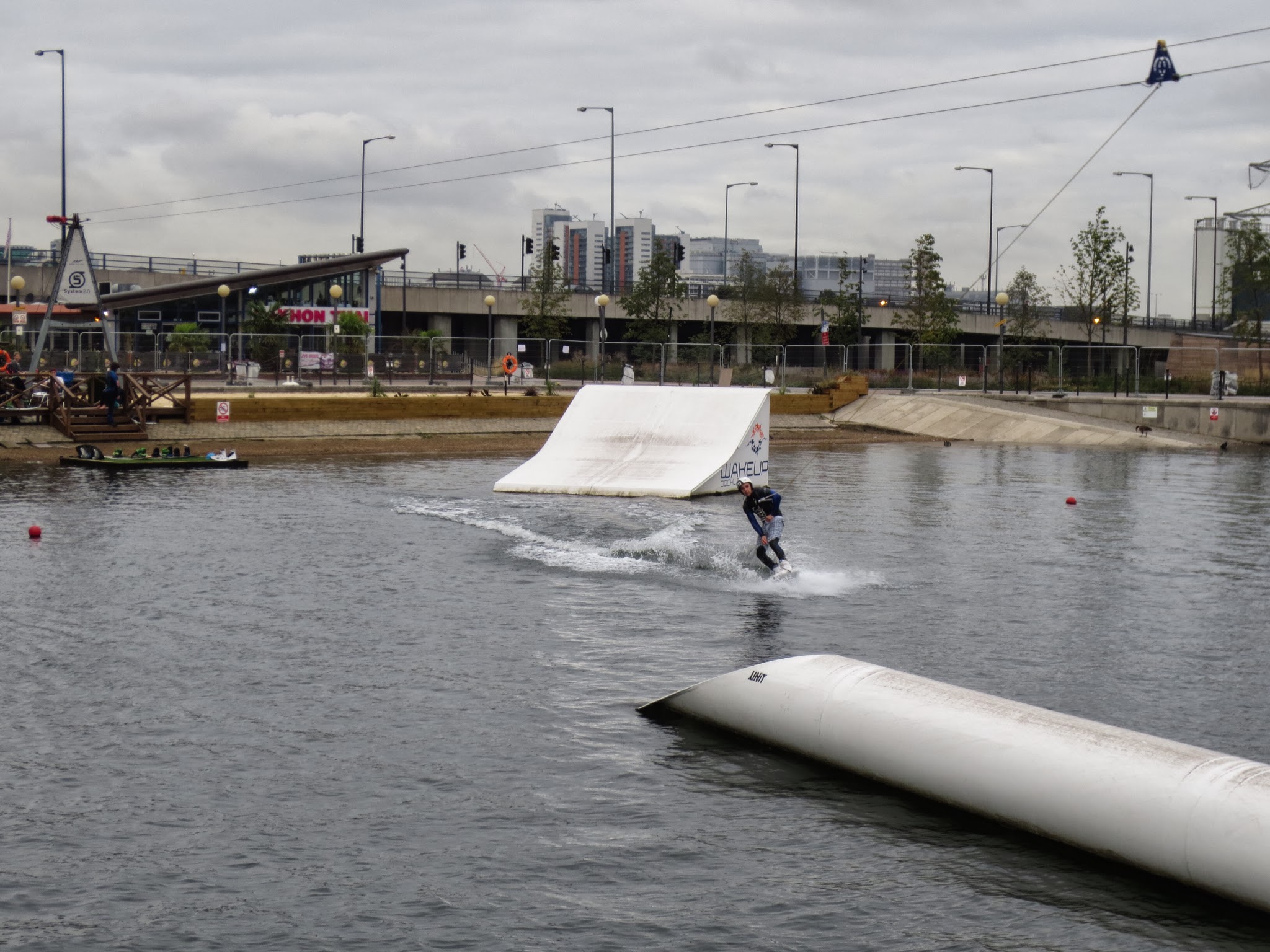 Some watersport at the Royal Docks. Wake boarding utilizing a mechanical "boat" to pull the board rider.